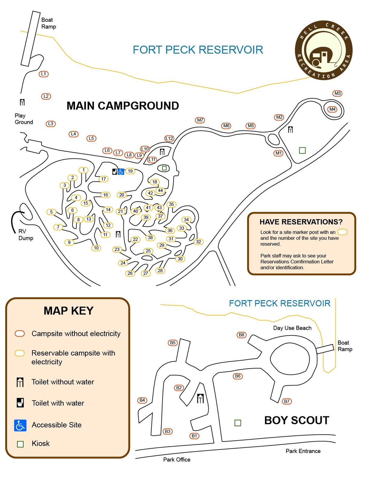 Hell Creek also serves as a launching point for boat camping in the wild and scenic Missouri Breaks. The parks is at an elevation of 2,231 feet and encompasses 337-acres There are 71 campsites, 44 of which have electrical hookups.